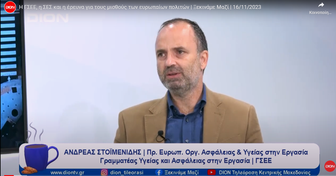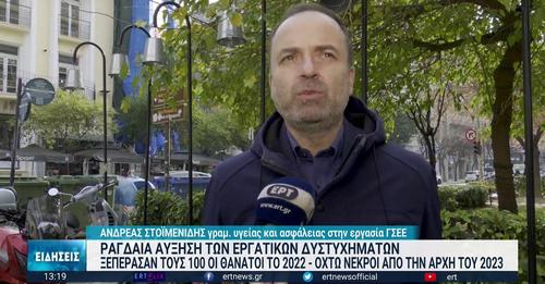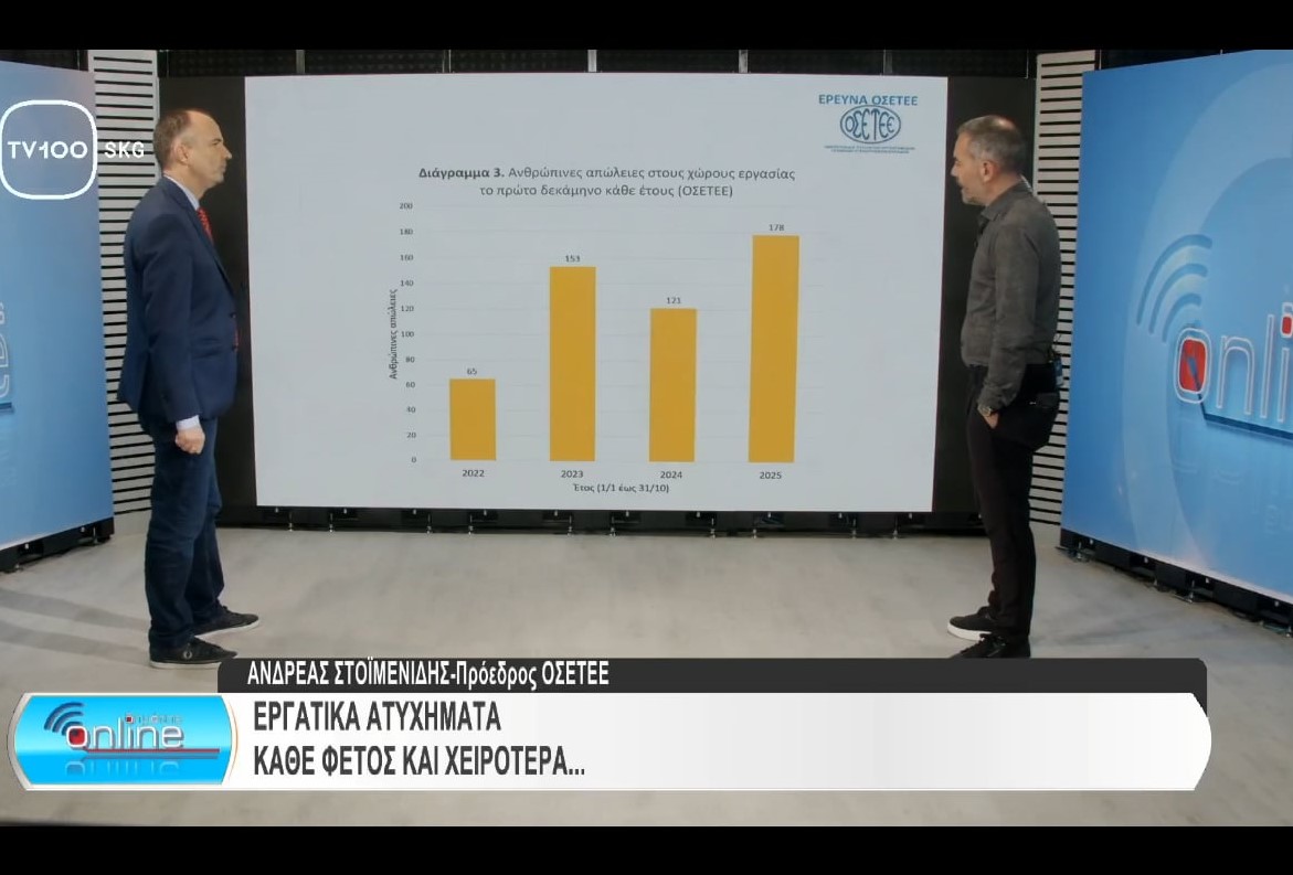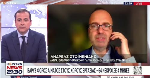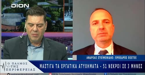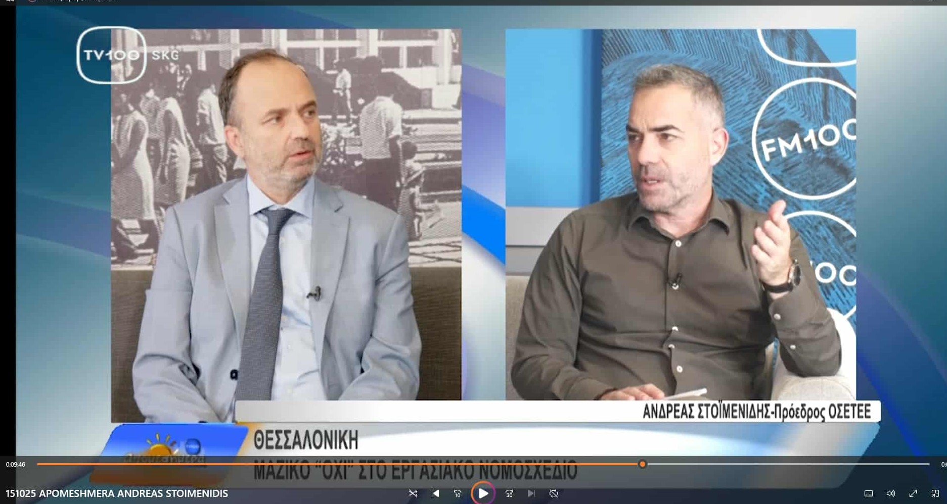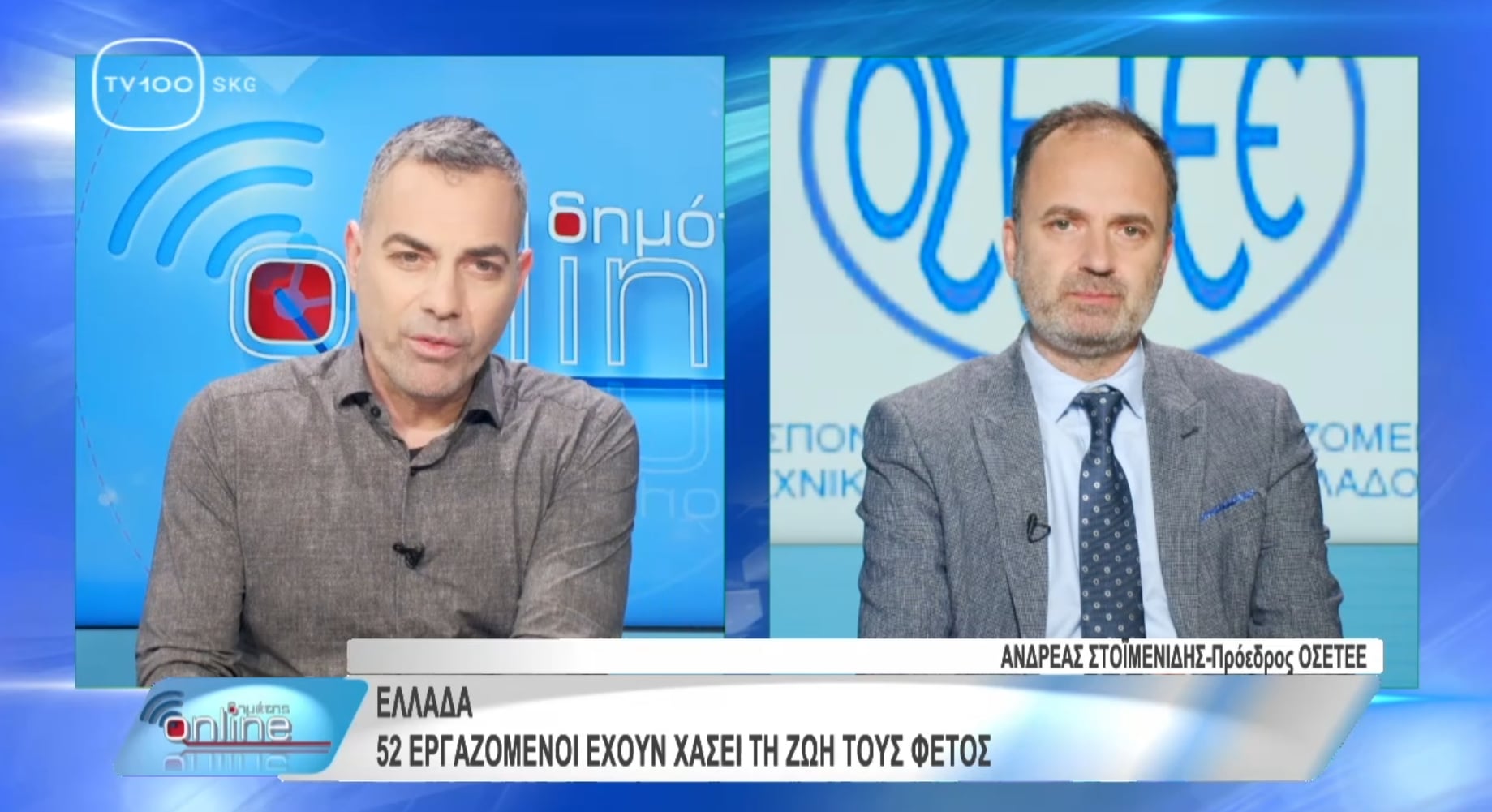 Συνέντευξη του προέδρου της ΟΣΕΤΕΕ, Ανδρέα Στοϊμενίδη στoν δημοσιογράφο Παναγιώτη Κρινή στην εκπομπή Δημότης On line στην TV100, με θέμα την ανάλυση της έρευνας της ΟΣΕΤΕΕ για τα εργατικά δυστυχήματα στην Ελλάδα.