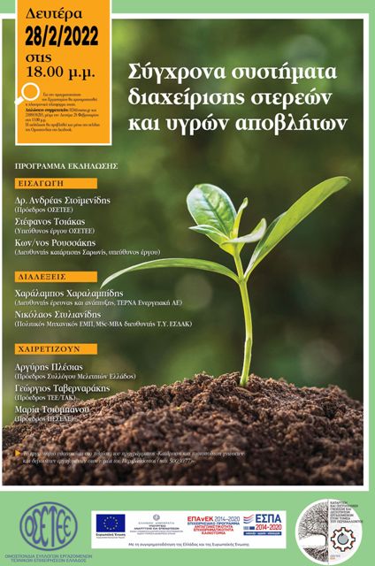 Η Ομοσπονδία Συλλόγων Εργαζομένων Τεχνικών Επιχειρήσεων Ελλάδος (Ο.Σ.Ε.Τ.Ε.Ε.)στο πλαίσιο της Πράξης «Κατάρτιση και πιστοποίηση γνώσεων και δεξιοτήτων εργαζομένων στον τομέα του Περιβάλλοντος», με Κωδ. ΟΠΣ 5003077, που υλοποιείται σύμφωνα με την υπ’ αριθμ. 5998/799/Α3 /15-11-2017 Απόφαση Ένταξης της Πράξης από την Ειδική Υπηρεσία Διαχείρισης του Ε.Π. «Ανταγωνιστικότητα, Επιχειρηματικότητα και Καινοτομία 2014-2020» με τη συγχρηματοδότηση της Ελλάδας και της Ευρωπαϊκής Ένωσης (Ευρωπαϊκό Κοινωνικό Ταμείο – ΕΚΤ) , έχοντας υπόψη την από 14-11-2018 Απόφαση του Δ.Σ. της Ομοσπονδίας, απευθύνει Πρόσκληση εκδήλωσης ενδιαφέροντος για την επιλογή Συνεργατών για την υλοποίηση του Υποέργου 1«Διαχείριση, παρακολούθηση και δημοσιότητα του έργου».