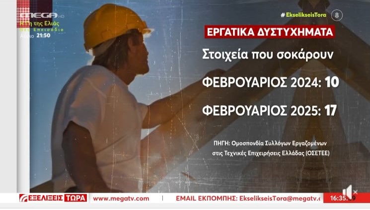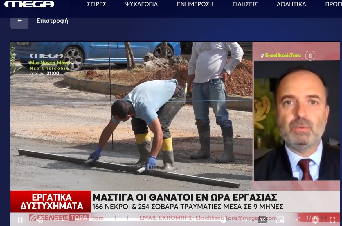 Ρεπορτάζ της δημοσιογράφου Ναταλίας Διονυσιώτη στην εκπομπή "Εξελίξεις Τώρα" της Αναστασίας Γιάμαλη στον τηλεοπτικό σταθμό Mega, για τα εργατικά δυστυχήματα και την υπόθεση του Μανώλη Αφράτη με δηλώσεις του Προέδρου της ΟΣΕΤΕΕ, Ανδρέα Στοϊμενίδη.
