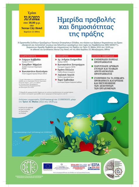 Η Ομοσπονδία Συλλόγων Εργαζομένων Τεχνικών Επιχειρήσεων Ελλάδος (Ο.Σ.Ε.Τ.Ε.Ε.)στο πλαίσιο της Πράξης «Κατάρτιση και πιστοποίηση γνώσεων και δεξιοτήτων εργαζομένων στον τομέα του Περιβάλλοντος», με Κωδ. ΟΠΣ 5003077, που υλοποιείται σύμφωνα με την υπ’ αριθμ. 5998/799/Α3 /15-11-2017 Απόφαση Ένταξης της Πράξης από την Ειδική Υπηρεσία Διαχείρισης του Ε.Π. «Ανταγωνιστικότητα, Επιχειρηματικότητα και Καινοτομία 2014-2020» με τη συγχρηματοδότηση της Ελλάδας και της Ευρωπαϊκής Ένωσης (Ευρωπαϊκό Κοινωνικό Ταμείο – ΕΚΤ) , έχοντας υπόψη την από 14-11-2018 Απόφαση του Δ.Σ. της Ομοσπονδίας, απευθύνει Πρόσκληση εκδήλωσης ενδιαφέροντος για την επιλογή Συνεργατών για την υλοποίηση του Υποέργου 1«Διαχείριση, παρακολούθηση και δημοσιότητα του έργου».