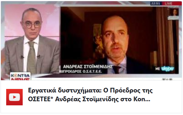 Ρεπορτάζ του δημοσιογράφου Νίκου Γιαννόπουλου για την παρουσίαση της έρευνας της ΟΣΕΤΕΕ και δηλώσεις του Προέδρου της ΟΣΕΤΕΕ, στον ιστότοπο Libre.gr με θέμα: "Εργατικά δυστυχήματα- Στοιχεία που σοκάρουν: Ποιοι εργαζόμενοι και σε ποιες ηλικίες είναι περισσότερο ευάλωτοι"