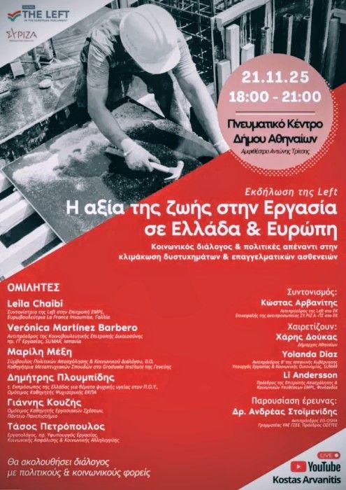 Η πολιτική ομάδα της Αριστεράς στο Ευρωπαϊκό Κοινοβούλιο (The Left) διοργανώνει εκδήλωση με θέμα «Η αξία της ζωής στην Εργασία σε Ελλάδα και Ευρώπη: Κοινωνικός διάλογος και πολιτικές απέναντι στην κλιμάκωση δυστυχημάτων και επαγγελματικών ασθενειών» αύριο Παρασκευή 21 Νοεμβρίου 2025 στις 6 το απόγευμα στο Πνευματικό Κέντρο Δήμου Αθηναίων (Αμφιθέατρο Αντώνης Τρίτσης).