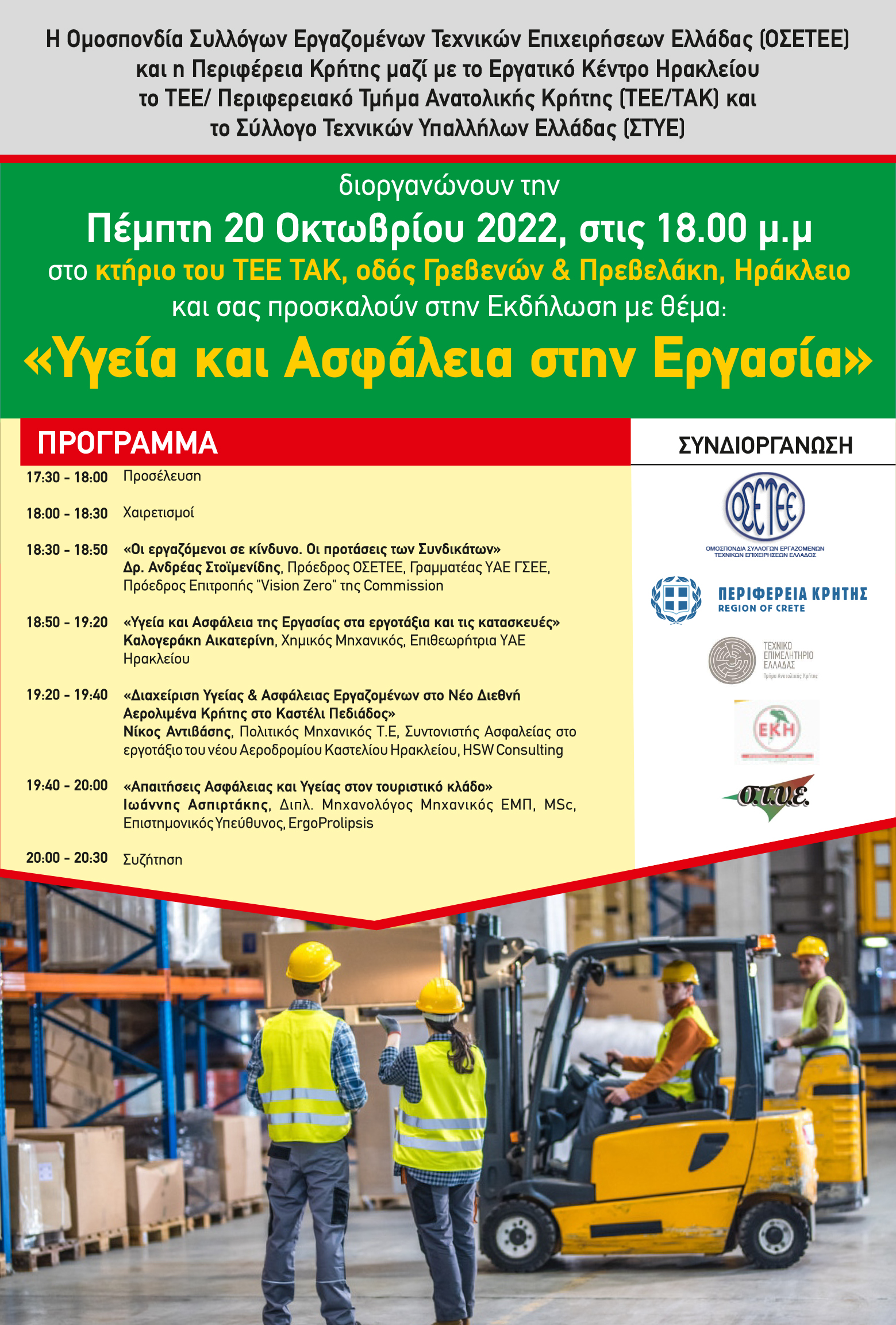 Με μεγάλη επιτυχία πραγματοποιήθηκε χθες στο Ηράκλειο Κρήτης, η εκδήλωση της ΟΣΕΤΕΕ και της Περιφέρειας Κρήτης για την "Υγεία και Ασφάλεια στην Εργασία"