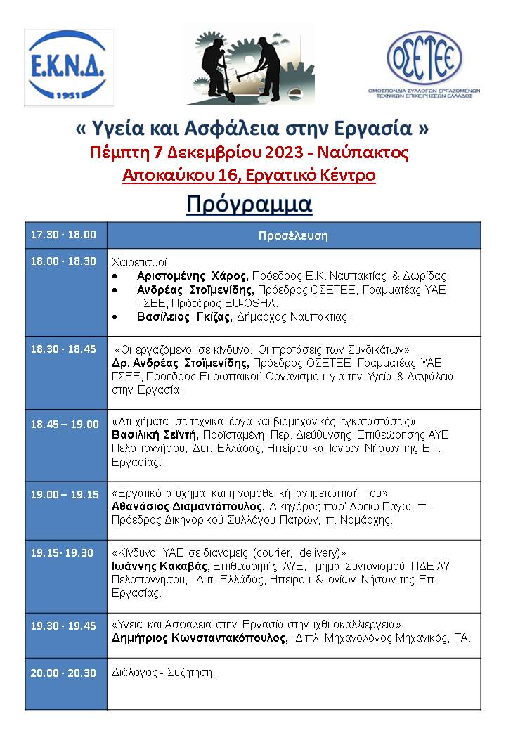 Εκδήλωση για την Υγεία και Ασφάλεια στην Εργασία στην Ναύπακτο την Πέμπτη 07/12