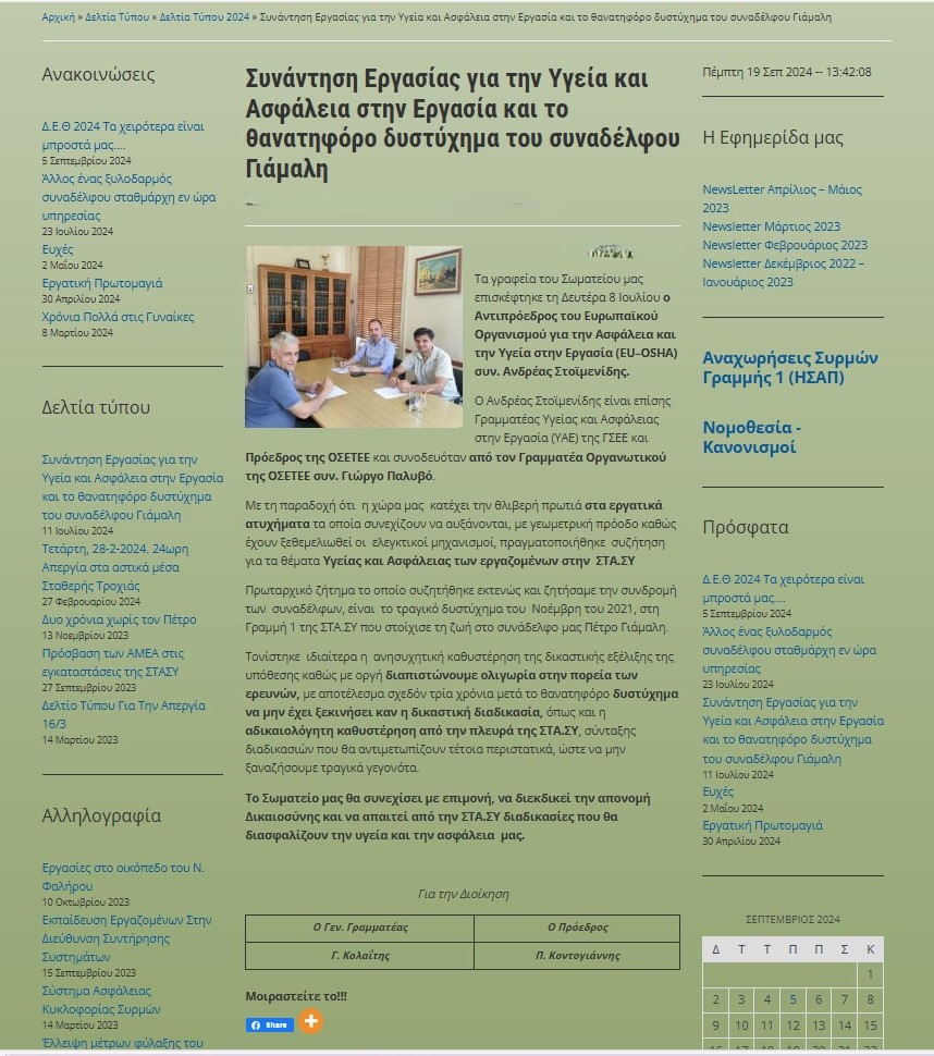 Συνάντηση Εργασίας ΟΣΕΤΕΕ με Σωματείο Εργαζομένων ΣΤΑ.ΣΥ για θέματα Υγείας και Ασφάλειας στην Εργασία
