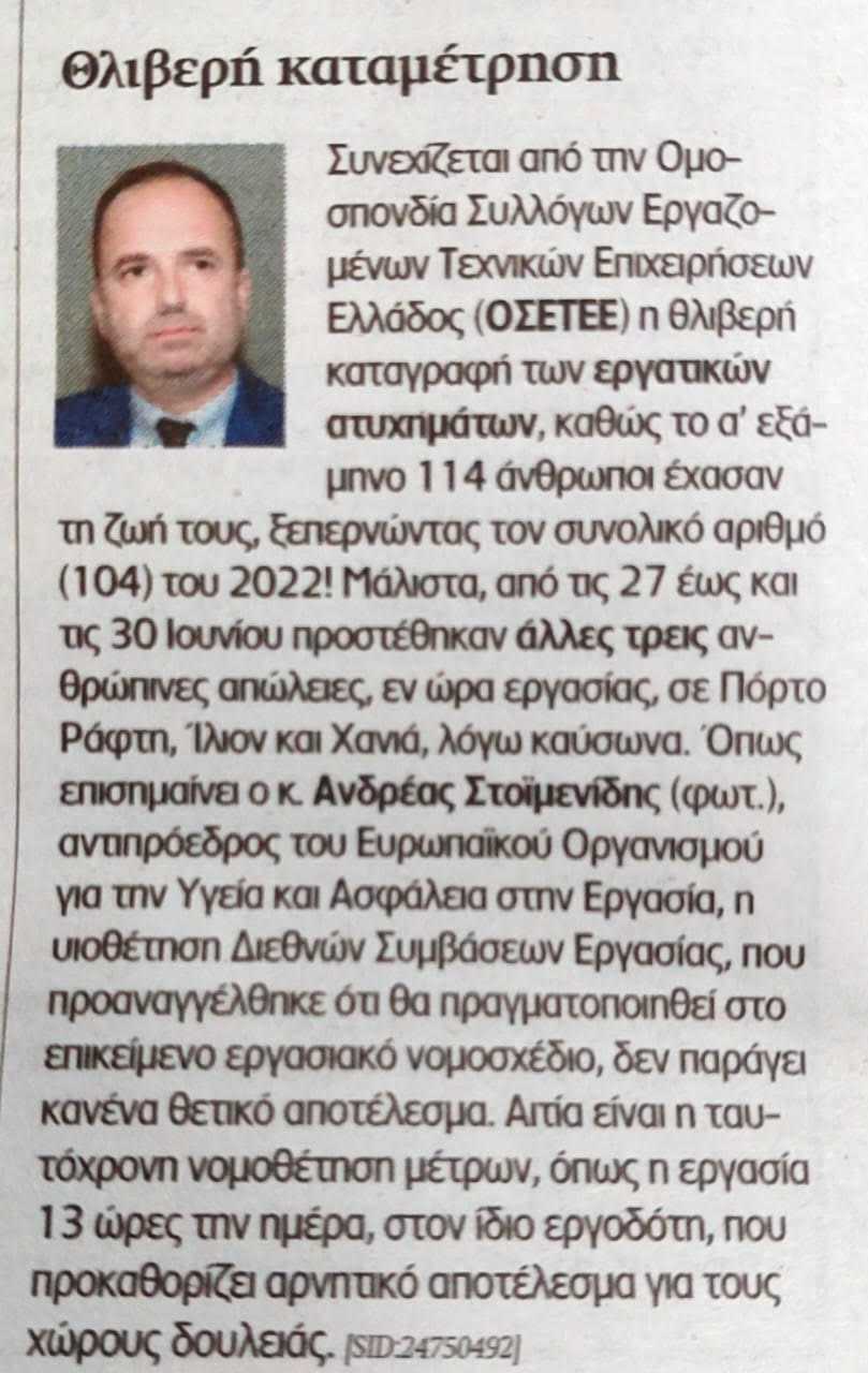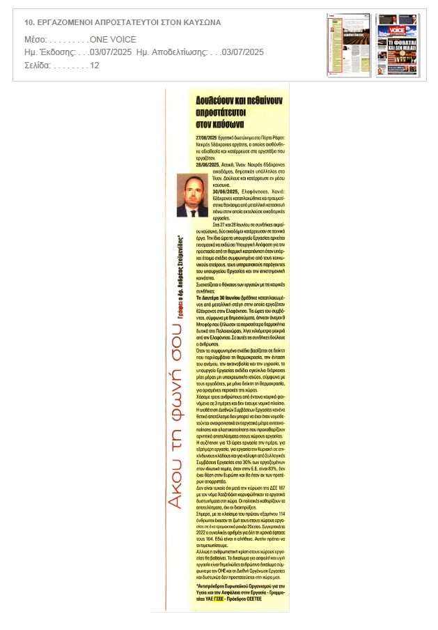 1. Άρθρο του Προέδρου της ΟΣΕΤΕΕ, Ανδρέα Στοϊμενίδη στην One Voice με θέμα: "Εργαζόμενοι απροστάτευτοι στον καύσωνα".